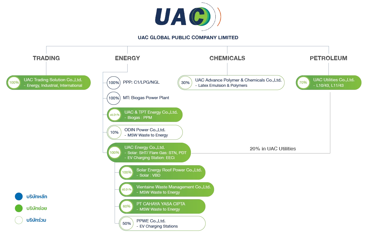 บริษัท ยูเอซี เอ็นเนอร์ยี่ จำกัด (“UAC Energy”) จัดตั้งขึ้นเมื่อวันที่ 26 สิงหาคม 2556 มีสถานะเป็นบริษัทย่อย ซึ่งบริษัทถือหุ้นในสัดส่วน ร้อยละ 99.99985 และผู้บริหารถือหุ้นในสัดส่วนร้อยละ 0.00015 มีทุนจดทะเบียนปัจจุบัน 200 ล้านบาท โดยมีวัตถุประสงค์เพื่อดำเนินธุรกิจเกี่ยวกับการลงทุนโครงการด้านพลังงาน อาทิ โรงไฟฟ้า โรงไฟฟ้าจากพลังงานแสงอาทิตย์ที่ติดตั้งบนหลังคา