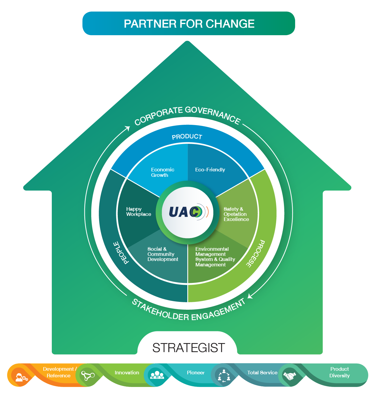 จุดมุ่งหมายของเราคือการสร้างการเติบโตอย่างยั่งยืนร่วมกันกับลูกค้า คู่ค้าและพันธมิตรทางธุรกิจ โดยมุ่งเน้น ในสามมิติ ซึ่งได้แก่ ด้านเศรษฐกิจ การเติบโตทางการเงิน, ด้านสังคม การพัฒนาบุคลากร, สภาพแวดล้อมการทำงานที่ดี, การพัฒนาชุมชนและสังคม และ ด้านสิ่งแวดล้อม กระบวนการทำงานที่เป็นเลิศ, ความปลอดภัย, การเป็นมิตรต่อสิ่งแวดล้อม, และระบบควบคุมคุณภาพที่ดี มีประสิทธิภาพ