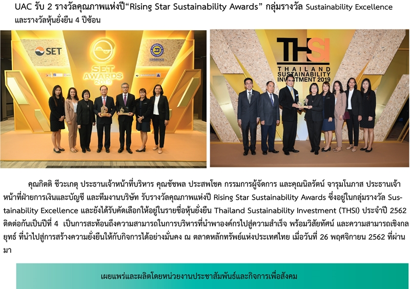 UAC รับรางวัล Rising Star Sustainability Awards กลุ่มรางวัล Sustainability Excellence เมื่อวันที่ 26 พฤศจิกายน 2562 ณ ตลาดหลักทรัพย์แห่งประเทศไทย