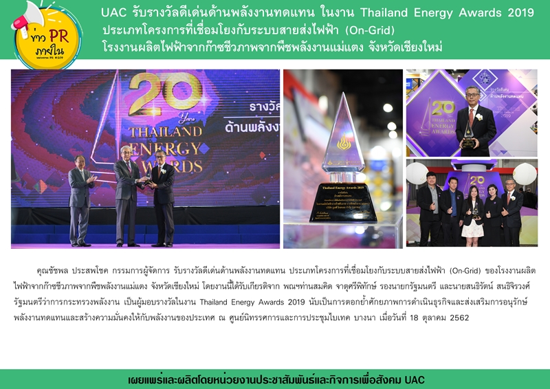 UAC รับรางวัลดีเด่นด้านพลังงานทดแทนในงาน Thailand Energy Awards 2019 ประเภทโครงการที่เชื่อมโยงกับระบบสายส่งไฟฟ้า (On-Grid) โรงงานผลิตไฟฟ้าจากก๊าซชีวภาพจากพืชพลังงานแม่แตง จังหวัดเชียงใหม่ เมื่อวันที่ 18 ตุลาคม 2562 ณ ศูนย์นิทรรศกาและการประชุมไบเทค บางนา