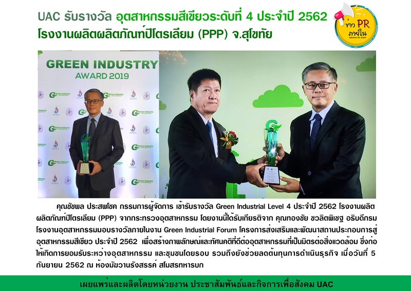 UAC รับรางวัลอุตสาหกรรมสีเขียวระดับที่ 4 ประจำปี 2562 โรงงานผลิตผลิตผลิตภัณฑ์ปิโตรเลียม (PPP) จ.สุโขทัย