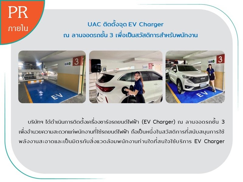 UAC ติดตั้งจุด EV Charger ณ ลานจอดรถชั้น 3 เพื่อเป็นสวัสดิการสำหรับพนักงาน
