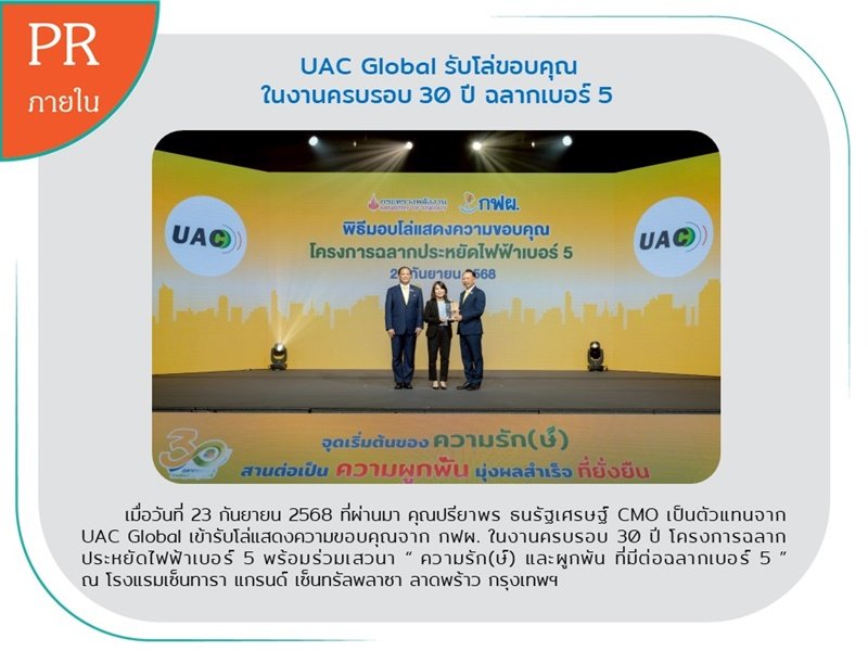 UAC Global รับโล่ขอบคุณ ในงานครบรอบ 30 ปี ฉลากเบอร์ 5